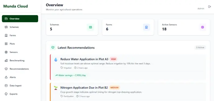 Munda AI turns on-farm information into actionable intelligence. Farmers gain insights into water use, crop performance, soil conditions, and operational efficiency. With clear dashboards and analytics, Munda AI makes it easier to plan, manage, and optimize farm operations.